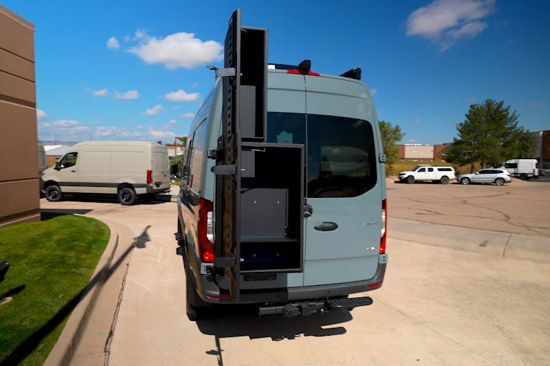 The design is clever: you feed the skis up through the bottom, they live on the left side, and your boots fit on the right. This frees up your interior garage space for other gear while keeping your skis secure and accessible. These boxes can be added to any Sprinter van with a rear mounting bracket.