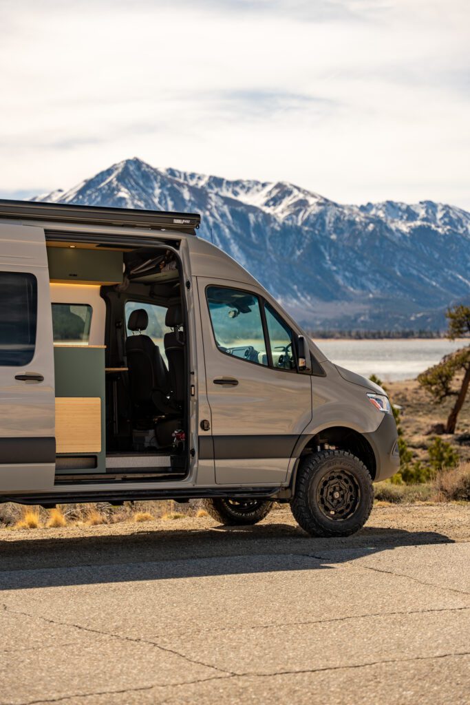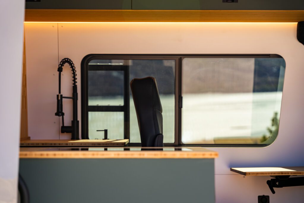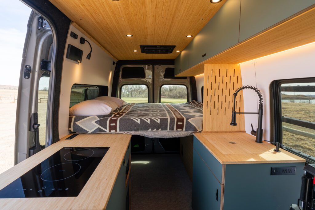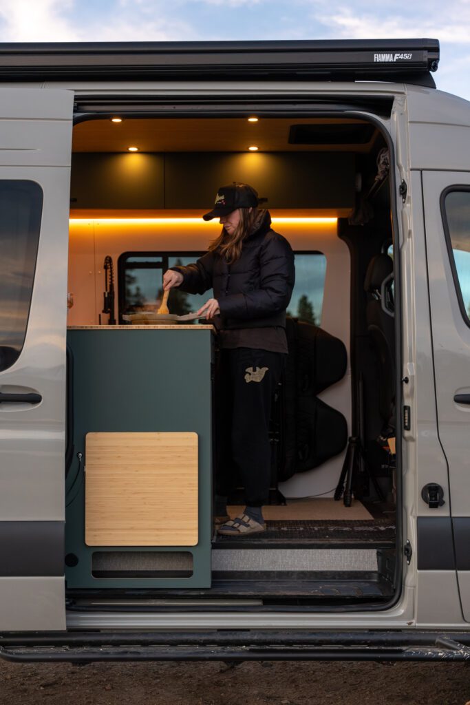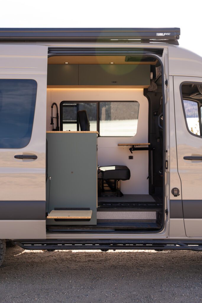 The split galley kitchen opens the center of the van, creating more room to cook, move, and gather inside.