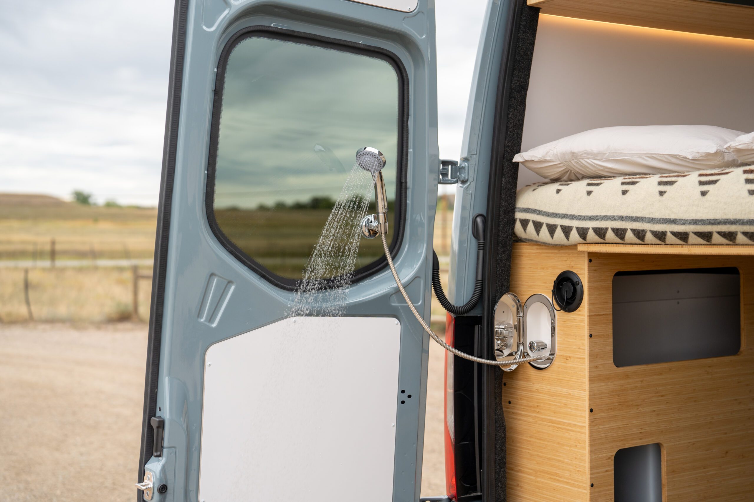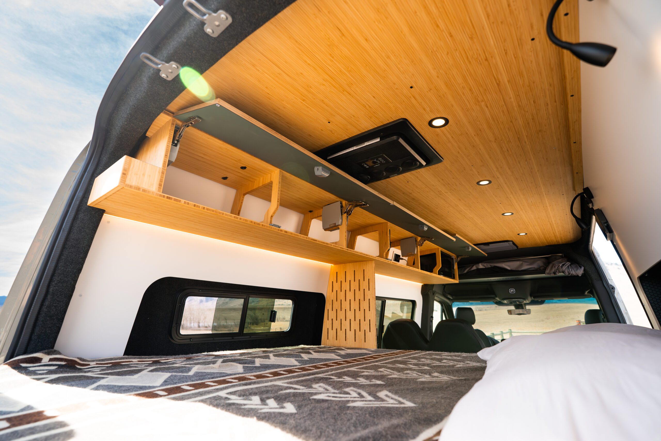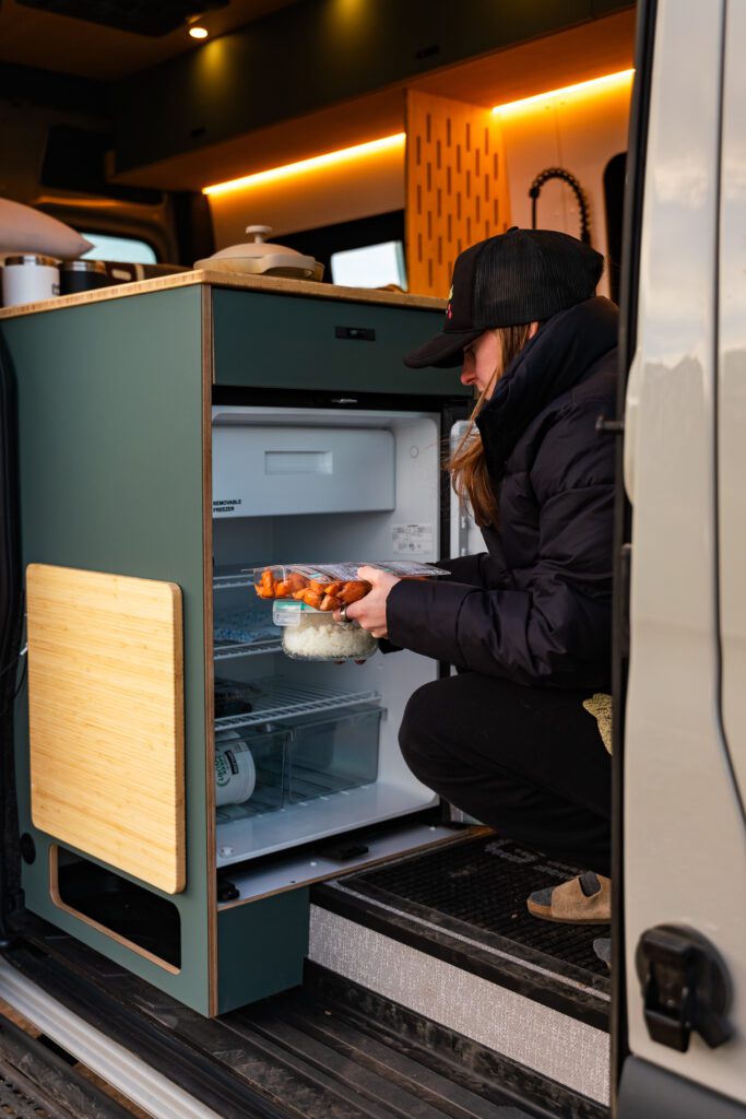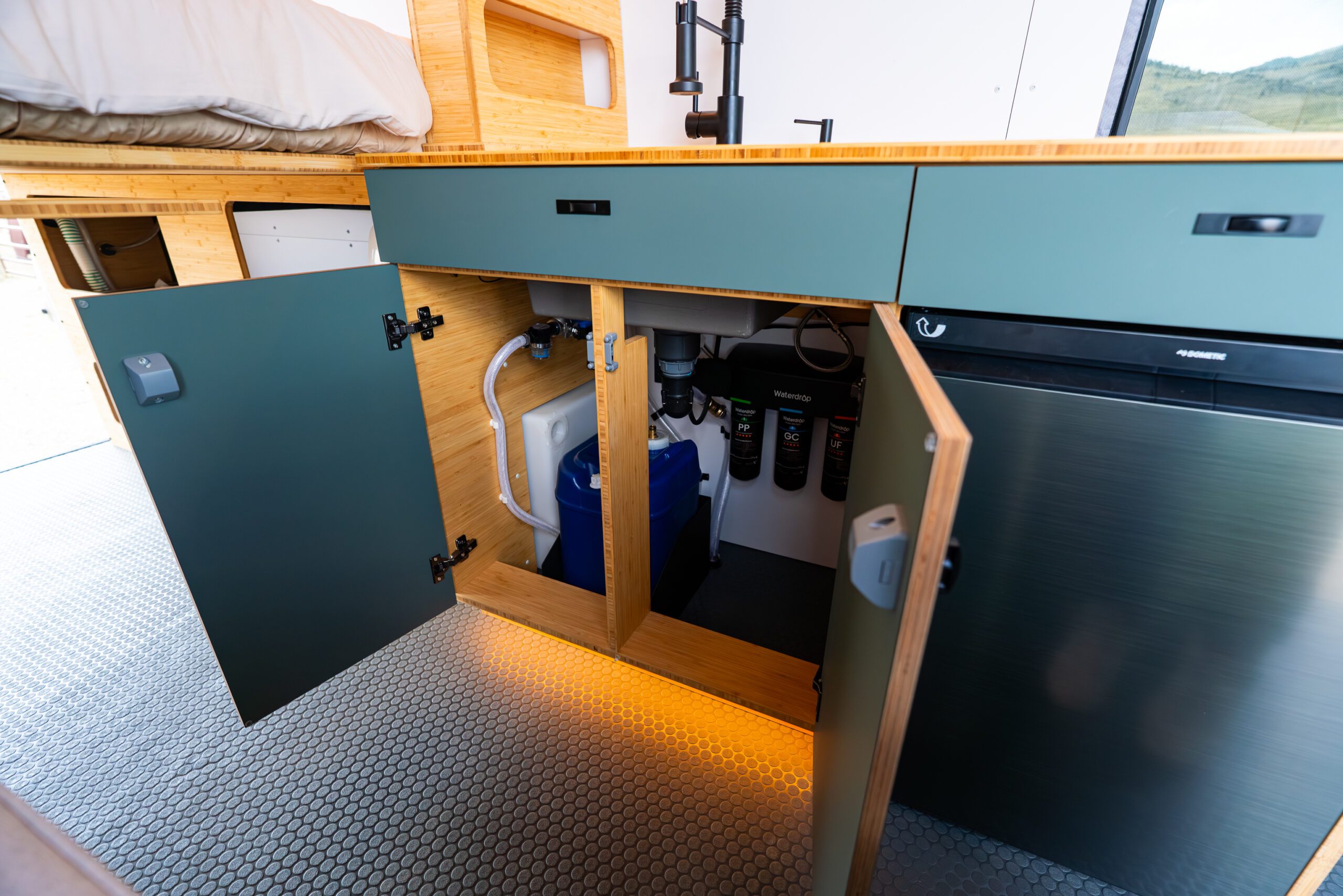 The split galley kitchen opens the center of the van, creating more room to cook, move, and gather inside.