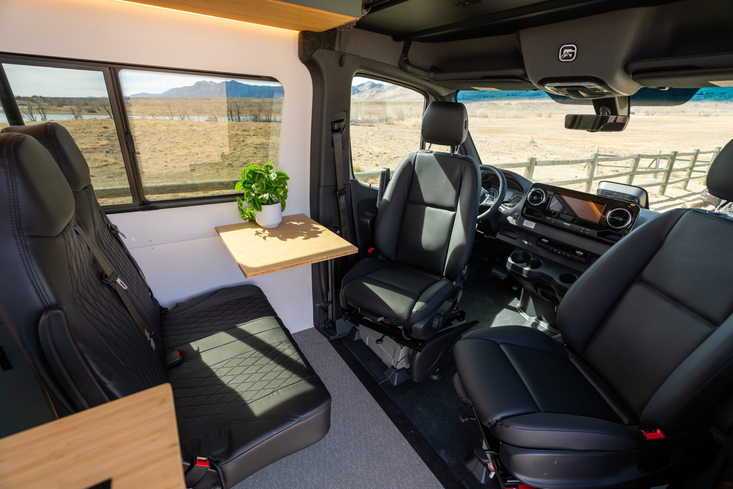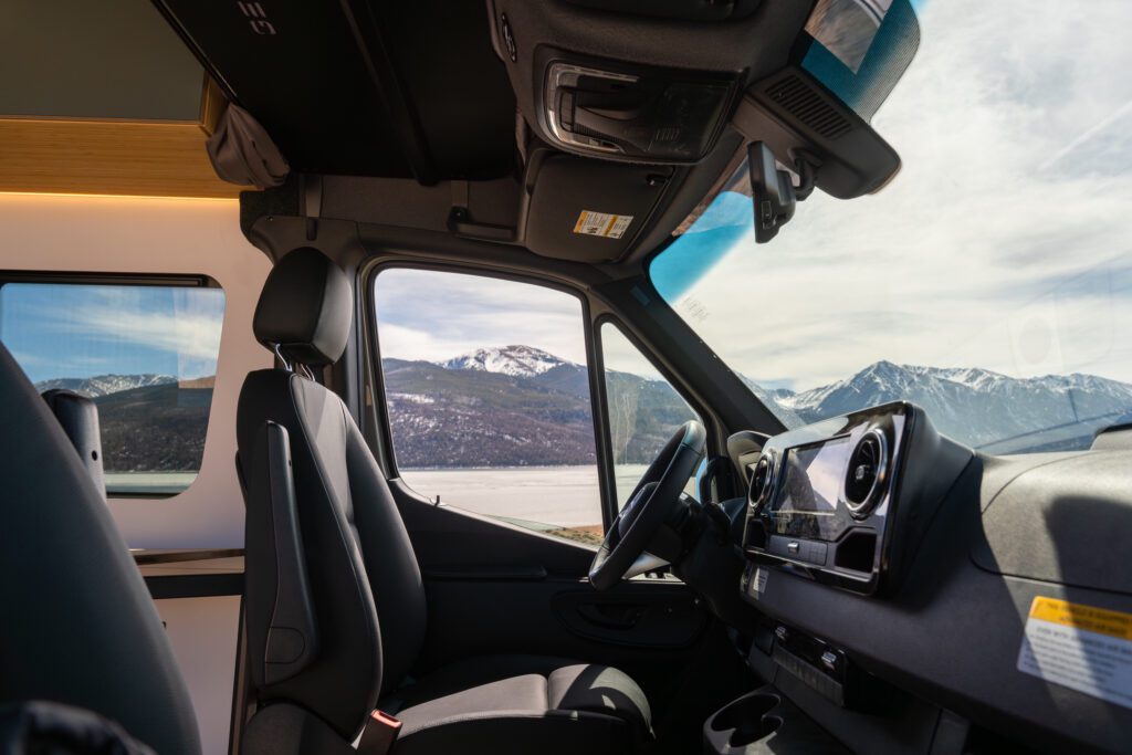Driver and passenger seats rotate into the living area to create a flexible lounge space.