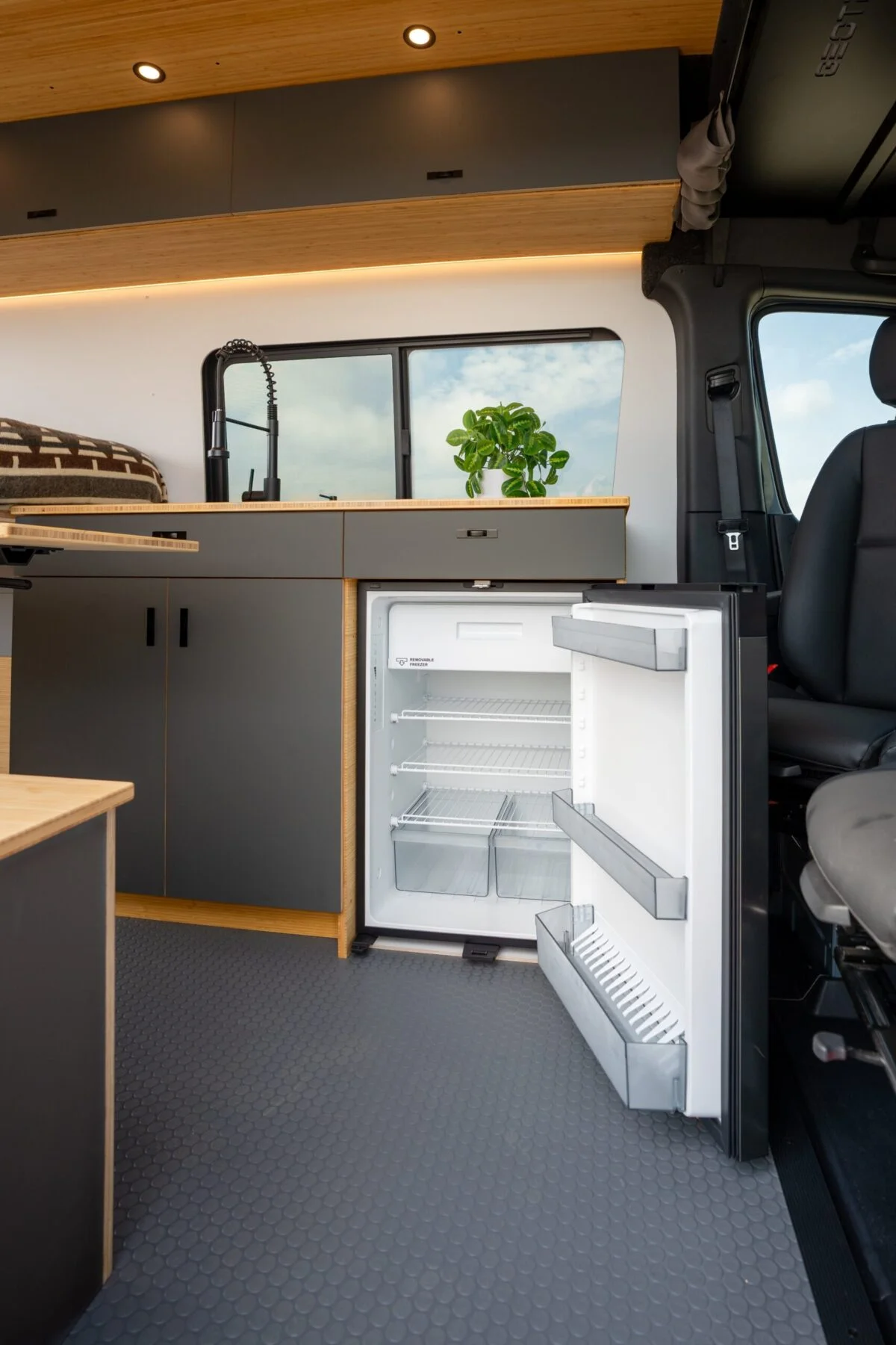 The EcoFlow lithium system delivers silent, reliable energy for induction cooking, climate control, and 120V/USB-C devices. Recharge fast via alternator while driving, shore power at camp, or roof-mounted solar—so you stay off-grid longer with less hassle.