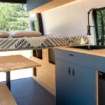 The Geotrek Bear Peak’s camper-van interior uses easy-clean surfaces, marine-grade upholstery, and a convertible lounge-to-sleep layout with generous overhead and under-bed storage, dimmable LED lighting, and convenient 12V/120V power—keeping gear organized and downtime comfortable on every trip.