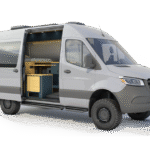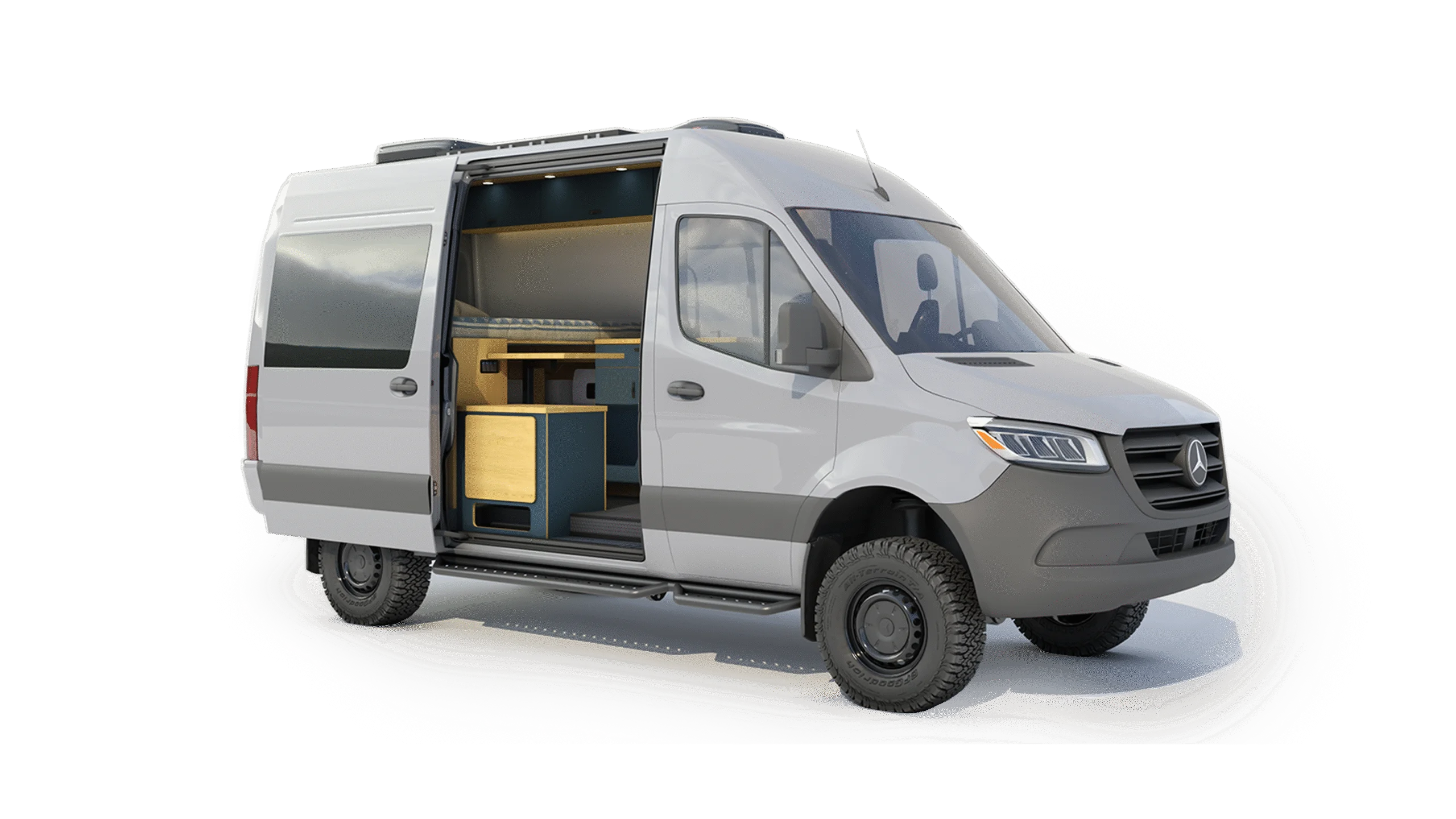 The Geotrek Flatiron layout is designed for optimal space efficiency, featuring a functional kitchen, convertible bed system, and ample gear storage for extended adventures. Built on the AWD Sprinter 144 chassis, it offers a perfect balance of comfort and capability for off-grid travel and vanlife enthusiasts.