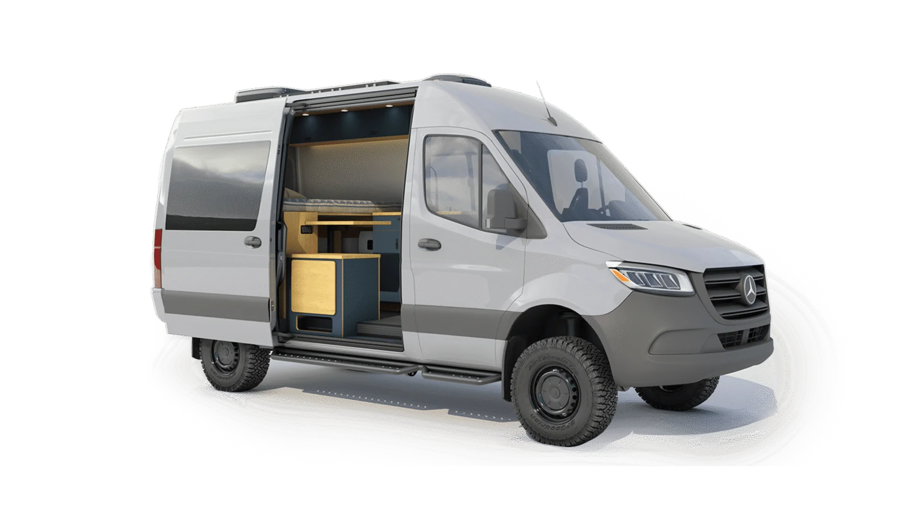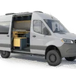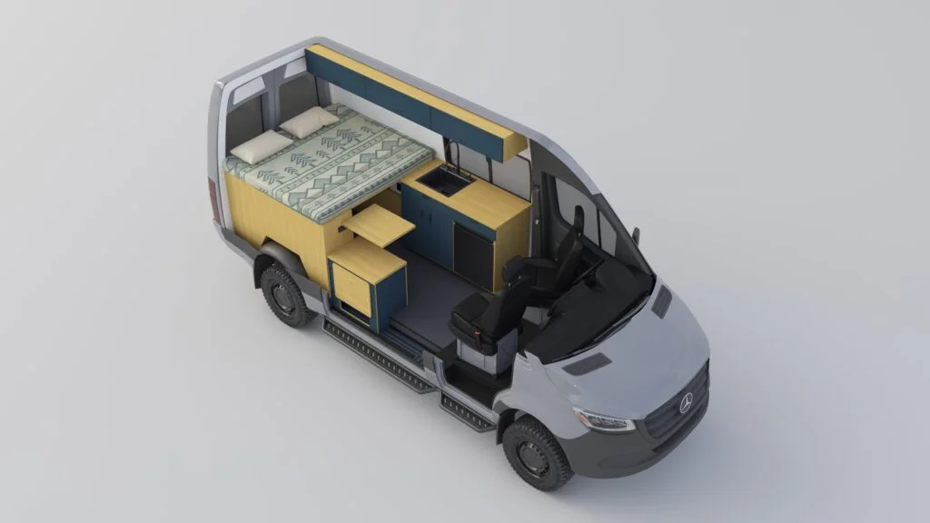 The Geotrek Flatiron layout is designed for optimal space efficiency, featuring a functional kitchen, convertible bed system, and ample gear storage for extended adventures. Built on the AWD Sprinter 144 chassis, it offers a perfect balance of comfort and capability for off-grid travel and vanlife enthusiasts.