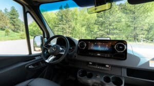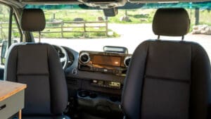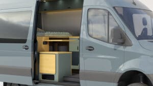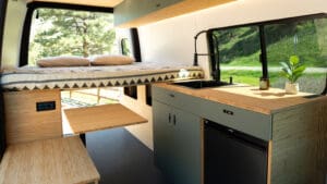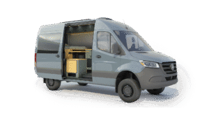 The Geotrek Bear Peak layout is designed for optimal space efficiency, featuring a functional kitchen, convertible bed system, and ample gear storage for extended adventures. Built on the AWD Sprinter 144 chassis, it offers a perfect balance of comfort and capability for off-grid travel and vanlife enthusiasts.