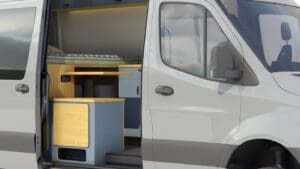 The Geotrek Albatross layout is designed for optimal space efficiency, featuring a functional kitchen, convertible bed system, and ample gear storage for extended adventures. Built on the AWD Sprinter 144 chassis, it offers a perfect balance of comfort and capability for off-grid travel and vanlife enthusiasts.