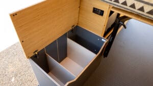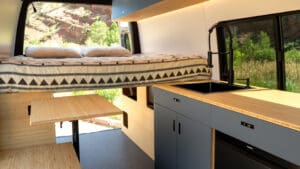 The Geotrek Bear Peak’s camper-van interior uses easy-clean surfaces, marine-grade upholstery, and a convertible lounge-to-sleep layout with generous overhead and under-bed storage, dimmable LED lighting, and convenient 12V/120V power—keeping gear organized and downtime comfortable on every trip.