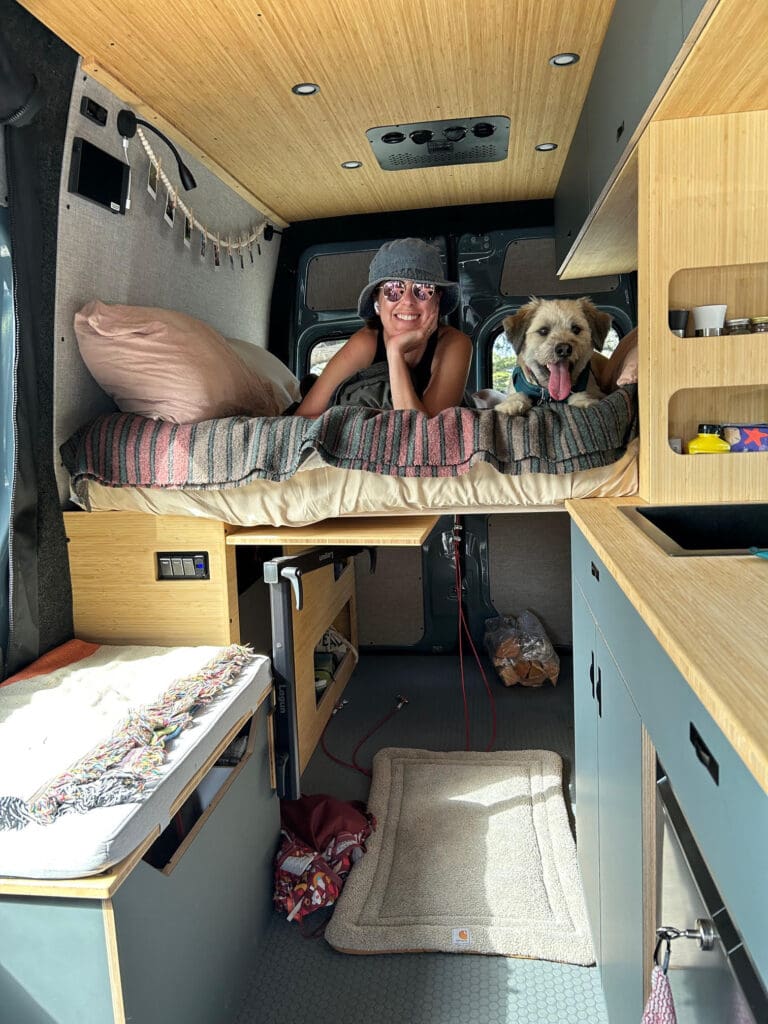 Kyle and Francis chose the Albatross layout for its north-south sleeping arrangement, which gives them plenty of room even when both dogs join them in bed. The spacious design means everyone sleeps comfortably – both humans and dogs – whether they’re parked at a trailhead or a beach access point.